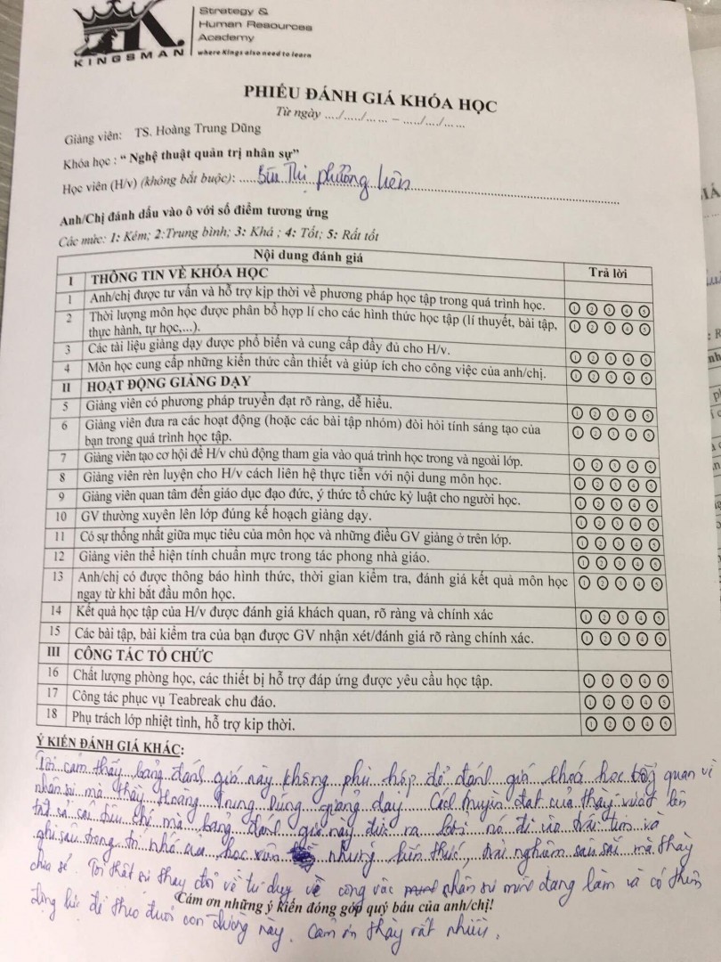 “Tôi thấy rằng bảng đánh giá này không phù hợp để đánh giá khoá học về nhân sự do thày Hoàng Trung Dũng giảng dạy. Cách truyền đạt của thày vượt lên tất cả các tiêu chí mà bảng đánh giá đưa ra, bởi nó đi sâu vào trái tim và ghi sâu vào tâm trí… Tôi thật sự thay đổi tư duy về công việc nhân sự mình đang làm và có thêm động lực để theo đuổi con đường này. Cảm ơn thầy rất nhiều”